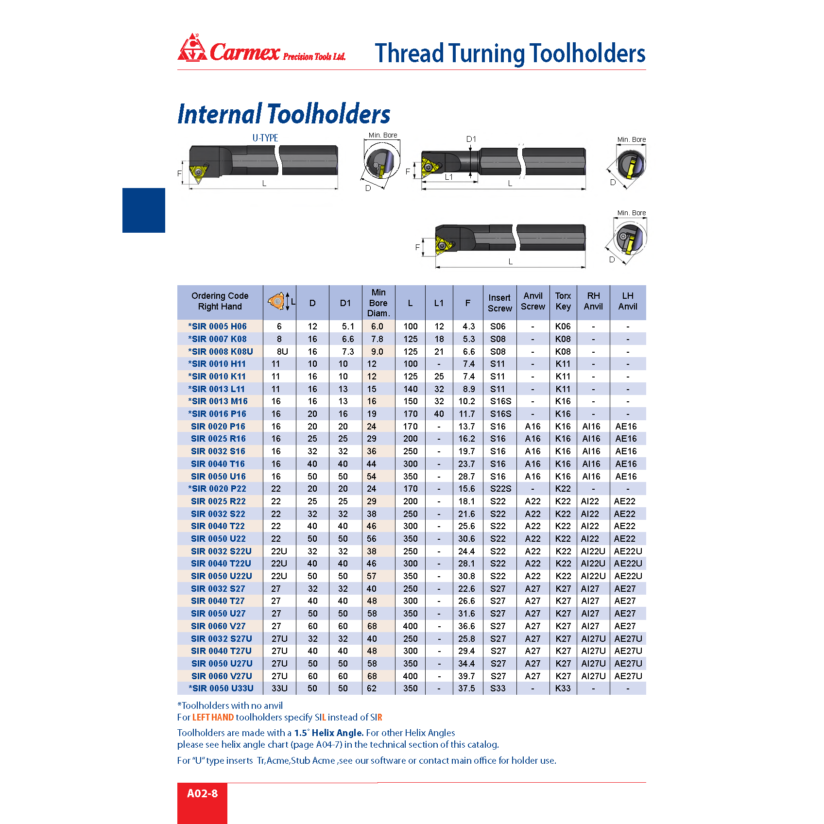 Manufactured from premium alloy steel with precision-ground surfaces, this toolholder guarantees reliable insert retention, reduced deflection, and extended tool life. The SIR 0050 U16 is compatible with the Carmex 16 IR insert series for ISO, UN, and Whitworth thread profiles—making it a versatile choice for a wide range of internal threading requirements.