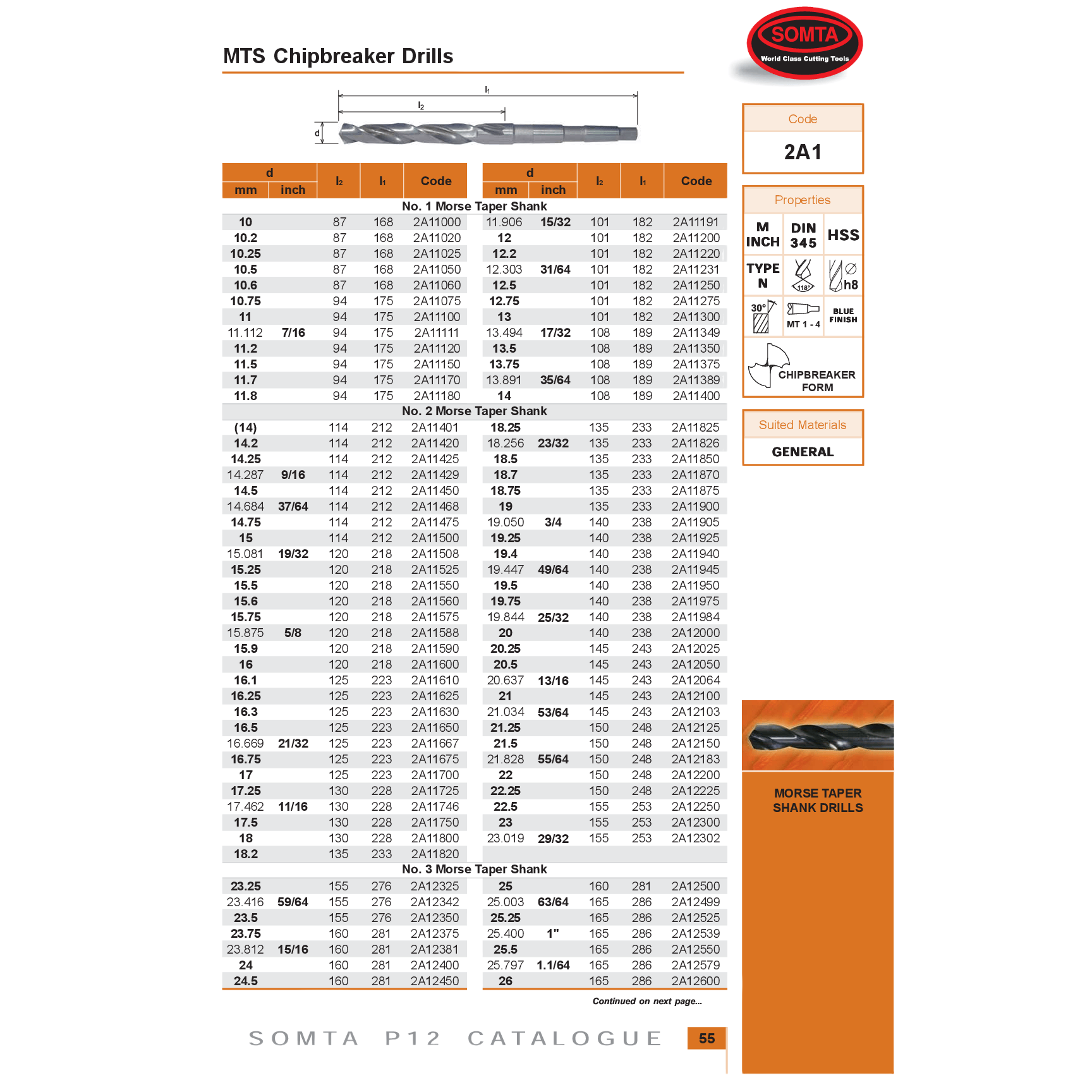 The SOMTA 2A12103 is a 53/64″ High-Speed Steel Morse Taper Shank (MT3) Chipbreaker Drill designed for efficient, precise, and clean drilling of steel, cast iron, and other general engineering materials. Its chipbreaker flute geometry ensures optimal chip formation and evacuation, reducing cutting forces and improving tool life in demanding production or workshop environments.